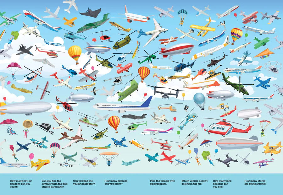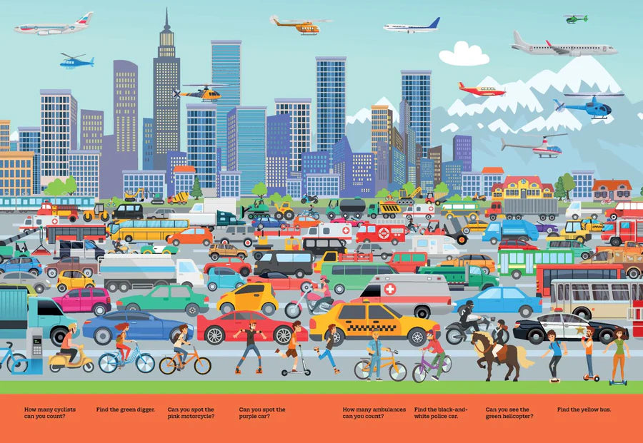 It’s time to whizz off and discover a world of things that go, whether in a busy building site, up in the air or out and about in the city. How ,many trains can your count? Which Vehicle is the odd one out on the building site? Have fun looking for the hidden objects in the busy scenes.